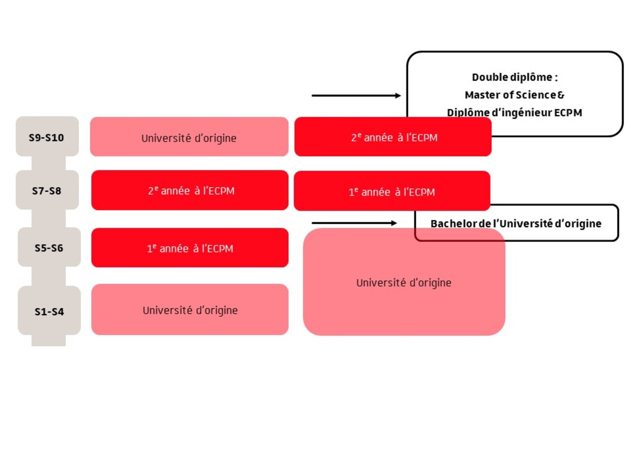 Les étudiants en provenance de ces universités intègrent l’ECPM en 1e (Semestre 5) ou en 2e année (Semestre 7, en fonction des universités.